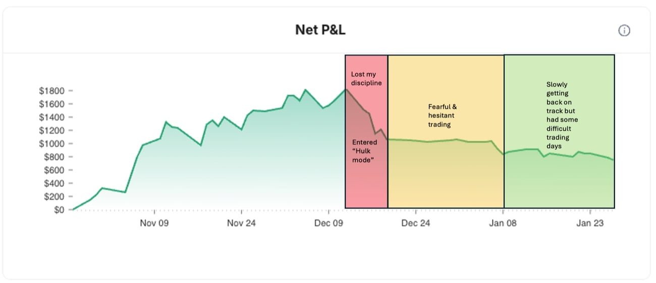 If you look at the annotated P&L chart, you can that profits were growing very well at first. Confidence was high. Then came a stretch labeled as “lost my discipline”, followed by what entering “Hulk mode.” Those days produced his biggest losses.
